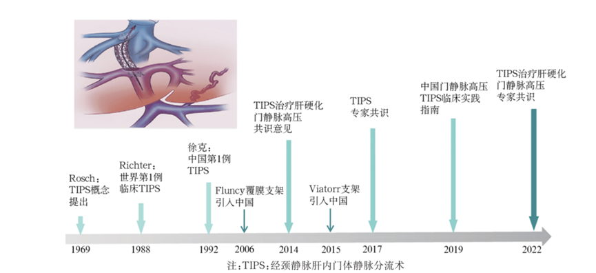 TIPS臨床效果迅速且明顯,獨特優(yōu)勢主要有3點:①創(chuàng)傷輕微、直接有效、針對性強、康復快、副反應小;②對難以控制和反復發(fā)作的食管-胃底靜脈曲張破裂出血效果突出;③對門脈高壓性胃病和頑固性腹水的治療效果突出。經頸靜脈肝內穿刺器械是該微創(chuàng)手術中使用的主要器械,過去主要依賴美國進口,嚴重影響我國TIPS手術的發(fā)展以及患者的治療需求。經頸靜脈肝內門體靜脈分流術(TIPS)是通過介入途徑在肝靜脈與門靜脈之間建立肝內分流道(圖1),旨在降低門靜脈壓力。從TIPS成功治療第1例門靜脈高壓靜脈曲張出血患者開始,經過30余年的臨床探索和改進(圖1),該技術目前已廣泛應用于藥物治療無效的門靜脈高壓及其并發(fā)癥。